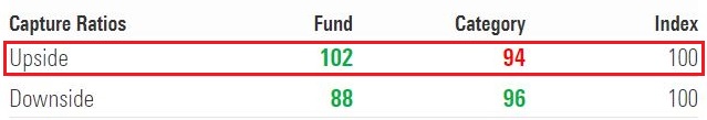 An upside capture ratio over 100 indicates a fund has outperformed the benchmark during periods of positive returns for the benchmark. In the case of Mirae Asset Large Cap Fund, the 10-year upside capture ratio is 102 which means the fund has performed better than the benchmark by 2% over this period.