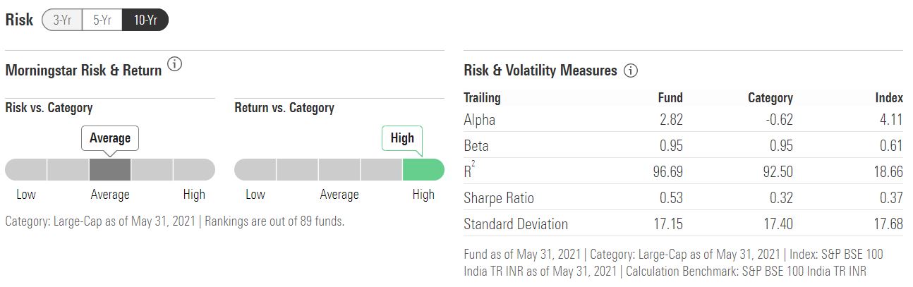 We selected the top performing fund over a ten-year period in the large cap category as on May 16, 2021, which is Mirae Asset Large Cap. On this page, you will see Risk and Volatility measures like Alpha, Beta, R2, Sharpe Ratio and Standard Deviation.