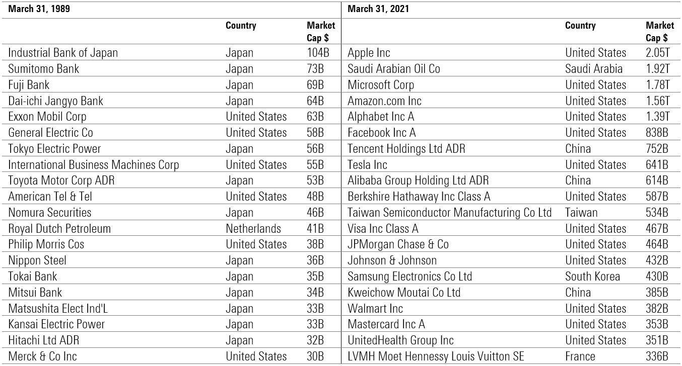 None. Zero. There were then six US companies on the list and their names are familiar to you. We have General Electric, we have Exxon, we have IBM Corp. None made it to the list 30 years later.