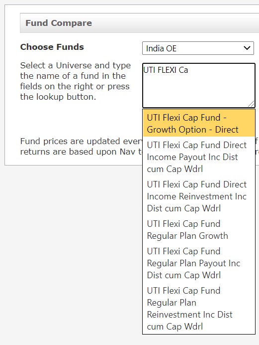 Type the name of the fund you wish to search in the box shown below and you will get a list of options from that fund which include direct, regular, dividend reinvestment, dividend payout, and so on. Each fund will typically have 6 plans.