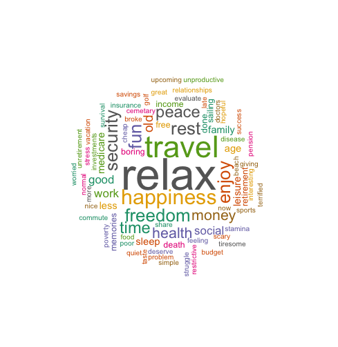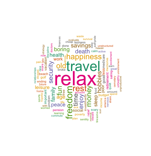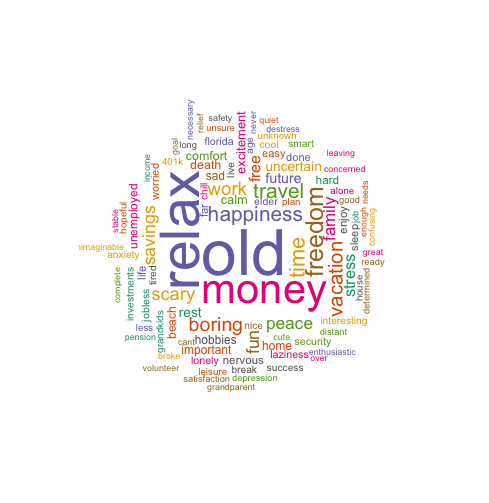We see once again that age is not at the epicenter of retirement. Rather, we again focus on the finer things in life: vacations, travel, relaxation, and happiness. Some negatives still appear, but they are generally isolated to the outermost regions of the cloud, indicating that they are on the minds of older adults to a lesser extent than of their younger counterparts.