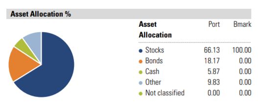 This pie chart and table depict the portfolio's exposure to the following broad asset classes: Stocks, Bonds, Cash and Other. The Other category represents an asset class that Morningstar recognizes but classifies outside of the asset classes listed above. (For example, real estate is typically classified as Other.) Not Classified is for those securities Morningstar does not recognize or track. The tables adjacent to the pie chart identify the net asset allocation percentages of the portfolio, as well as the component long positions (assets) and short or marginal positions (liabilities) of the portfolio.