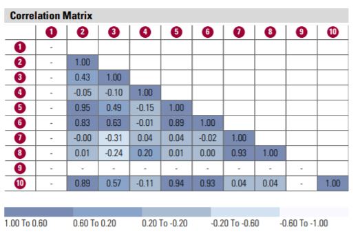 The matrix shows the performance correlation between different holdings. A correlation of 1 indicates the two holdings move in the same direction, a correlation of -1 indicates the two holdings move in opposite directions and a correlation of 0 means that no correlation could be found. A correlation of -1 will offer maximum diversification.