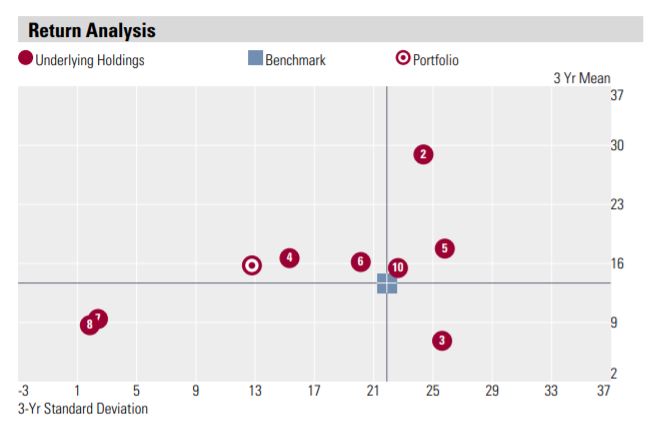 The risk/reward scatter plot is based on each holding's risk and return over the most recent three-year period. Risk is measured as 3-year standard deviation of return. Return is measured as 3 year mean return. The risk/reward scatter plot also contains the portfolio's risk and return.