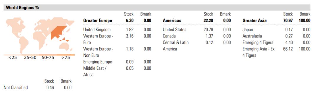 This data set provides a broad breakdown of portfolios' geographical exposure, by region and by market maturity. Only non-cash equity assets are evaluated in determining the exposures. Not Classified indicates the percentage of the equity portion of the portfolio for which Morningstar is unable to assess region or origin.