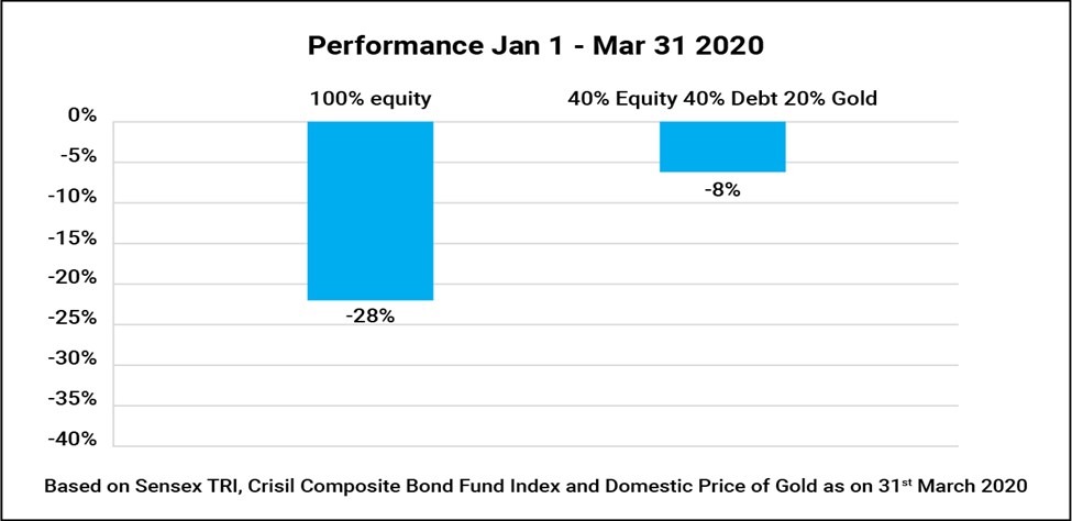 For instance, the year 2020 was a reminder of the virtues of asset allocation. An investor who would have saved 100% in equities would have seen their portfolio value reduce for the 3 months ending March 2020, at the peak of the pandemic. On the other hand, during the same period gold prices went up. Thus, a person who would have diversified in Equity, Debt and Gold would have minimized downside risks and earned better risk-adjusted returns than an investor who invested only in equities.