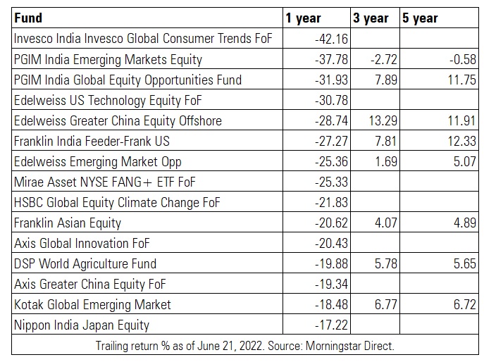 Barring DSP World Mining Fund and Aditya Birla Sun Life Commodities Equity – Global Agri Fund, all other funds have delivered negative return in the range of -1.48% to -42.16% over a one-year period as of June 21, 2022.