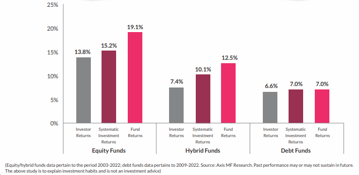 To quantify the effects of Indian investors’ frequent churn decisions on their long-term returns, Axis Mutual Fund analysed investor behavior for equity and hybrid funds over the last 20 years (2003-2022) and debt funds over the last 14 years (2009-2022). The findings indicate that investor returns were significantly worse than both point-to-point fund returns as well as systematic investment returns for all the three categories.