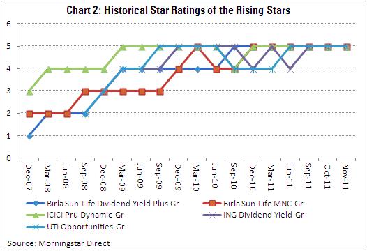 Birla Sun Life Dividend Yield Plus: After a disappointing 2005 and 2006 (where it featured in the bottom 10% of funds in the category), and a mediocre 2007; the fund showed its mettle in the market fall of 2008 and again in the volatile years of 2010 and 2011. As a result, it climbed the ratings ladder from 1 in 2007 to 5 stars currently.