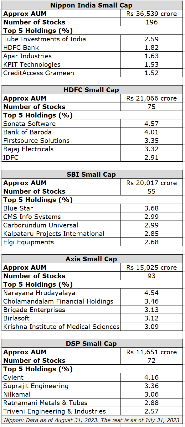 Here are the largest small-cap funds in terms of assets managed. Look at the difference in stock selection, as well as allocation to the top holdings.