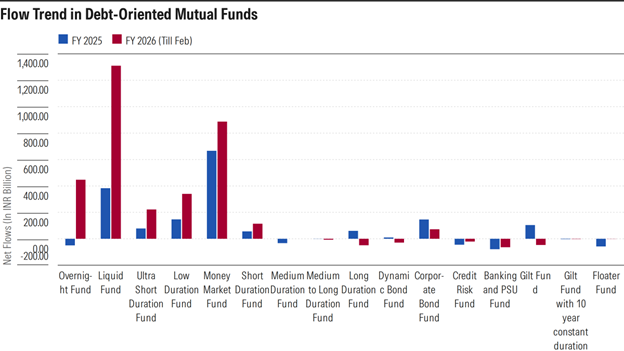 Debt mutual fund flows in FY2026 (till February) reflect a marked shift in investor preference compared to FY2025, with a strong tilt toward liquidity-oriented and short-duration categories. Overall flows have risen sharply from about INR 1,384 billion in FY2025 to nearly INR 3,171 billion in FY2026 (till Feb), indicating heightened allocation to debt as an asset class. However, this increase is largely driven by institutional and treasury-led allocations into liquid, overnight, and money market funds rather than broad-based duration or credit exposure. Liquid funds, in particular, saw a significant jump in inflows, alongside a sharp turnaround in overnight funds from outflows in FY2025 to strong inflows in FY2026, highlighting the preference for low-risk avenues to park surplus cash amid an uncertain environment.